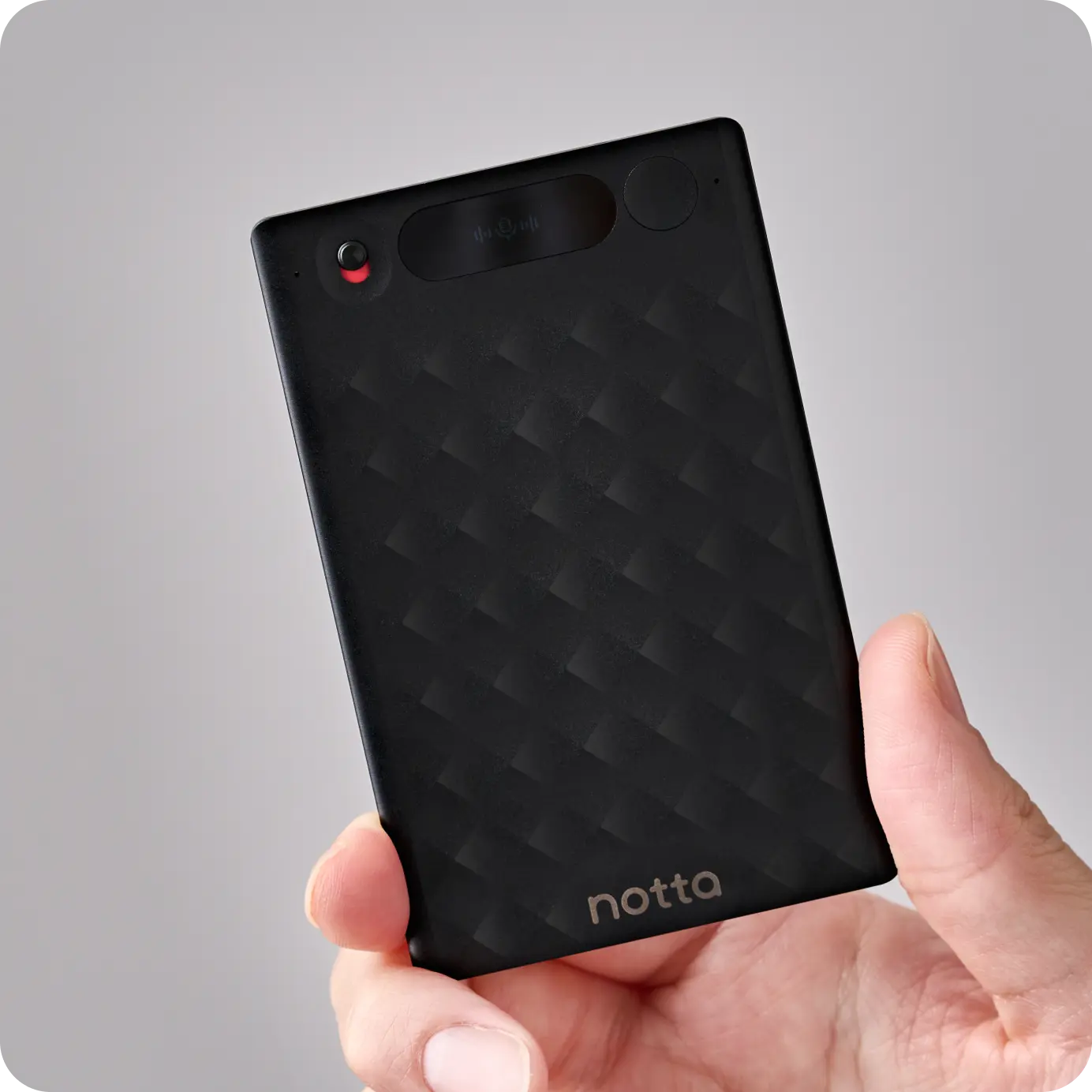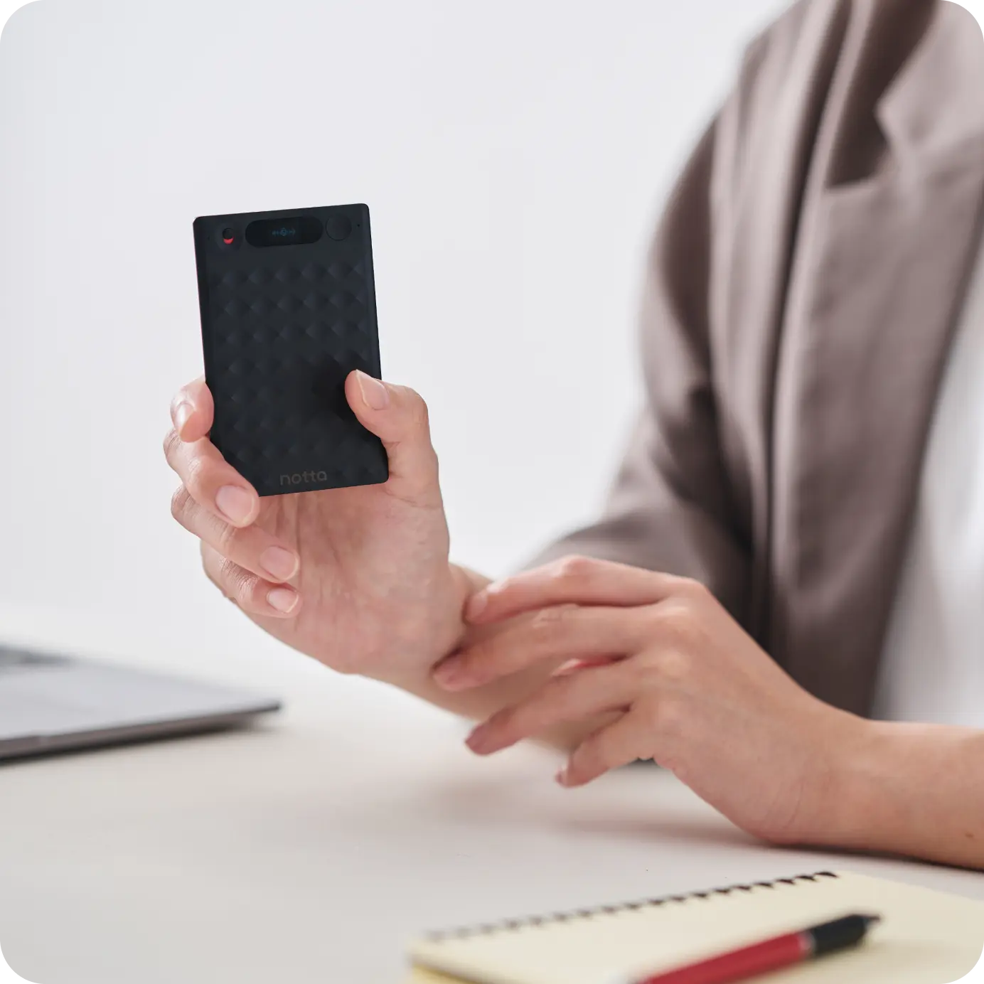 Notta Memoは、クリアな音声で最大98%の精度を実現します。4つのマイクアレイと高度なAI処理により、複数の話者、アクセント、専門用語を、競合デバイスよりも優れた精度で認識します。