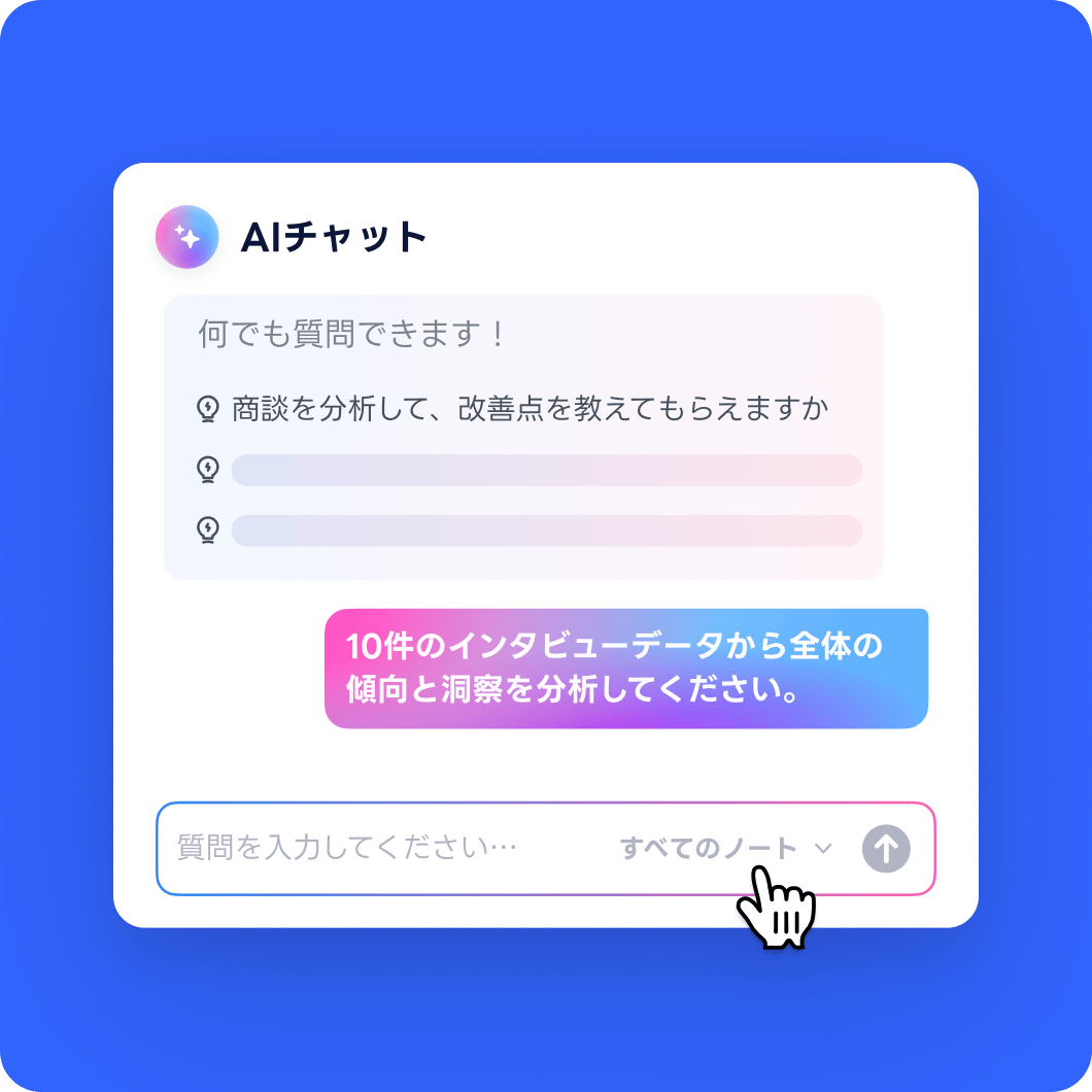 チャット形式でAIに質問するだけで、膨大な情報から最適な答えを瞬時に提示。会議の要約やアクションアイテム抽出、ナレッジ検索などを通じ、業務遂行と思考プロセスを支援します。